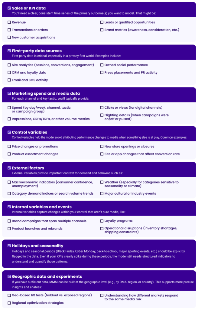 Successful MMM starts with the right data foundation. The more complete, clean, and consistent your data is, the more accurate and actionable your model will be.