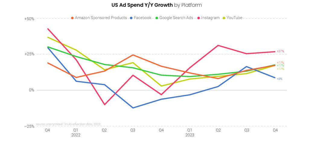 Looking across the major digital ad platforms of Facebook, Instagram, Amazon Sponsored Products, Google search, and YouTube, spending growth closed out 2023 on much stronger footing than it began the year.