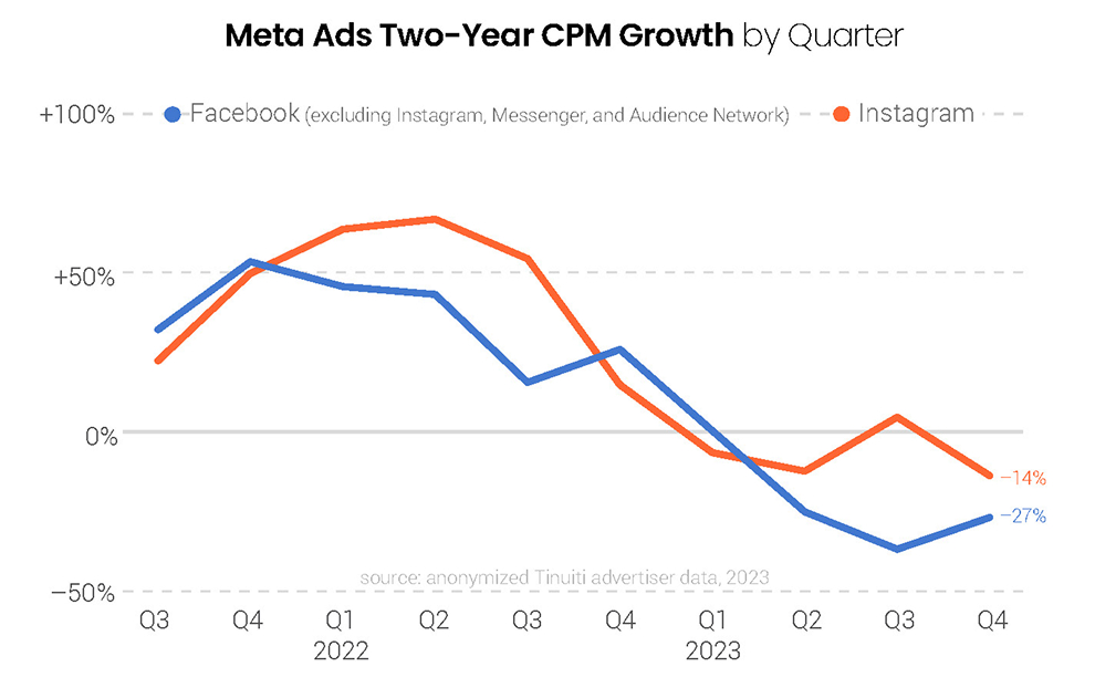In the final quarter of the year, Facebook advertisers saw CPM decline 27% relative to Q4 2021, the third straight quarter in which Facebook declined by at least 25% on a twoyear basis. Despite Instagram CPM growing 2% in year-over-year terms in the fourth quarter, the f irst positive growth since Q3 2022, impression pricing still fell 14% on a two-year basis. Pricing has been softer over the last year in part due to the rise of newer inventory sources like Reels across both Facebook and Instagram.