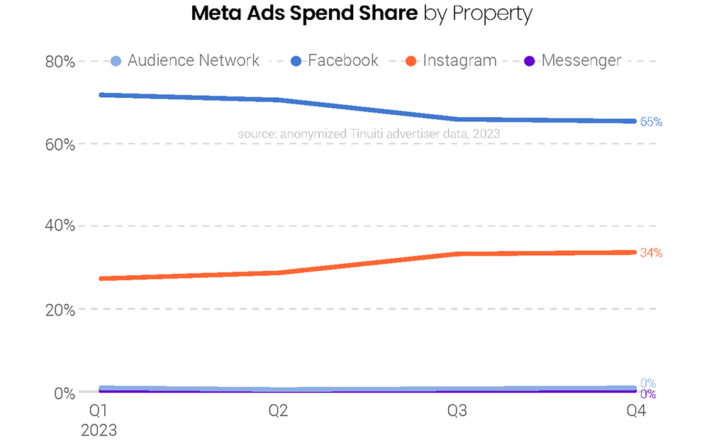 The share of total Meta Ads spend attributed to Facebook was 65% in Q4, as the oldest of Meta’s platforms continues to be the most important for advertisers. Instagram share has grown over the course of 2023, coming in at 34% in each of the final two quarters of the year. The Audience Network, which was hit harder by Apple’s App Tracking Transparency prompt than other Meta platforms, continues to account for only a tiny share of spend.