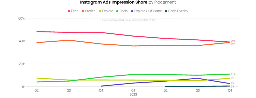 In Q4 2023, Instagram Feed placements accounted for 39% of ad impressions on the platform, down from 41% the quarter prior, and equivalent to the share attributed to Instagram Stories. Reels placements accounted for 11% of ad impressions, up from 8% in Q4 2022, while Explore and Explore grid home placements combined for 10% impression share. Reels overlay ads still account for only a trickle of impressions, but may yet grow more meaningful as evidenced by the format’s share of Facebook impressions.