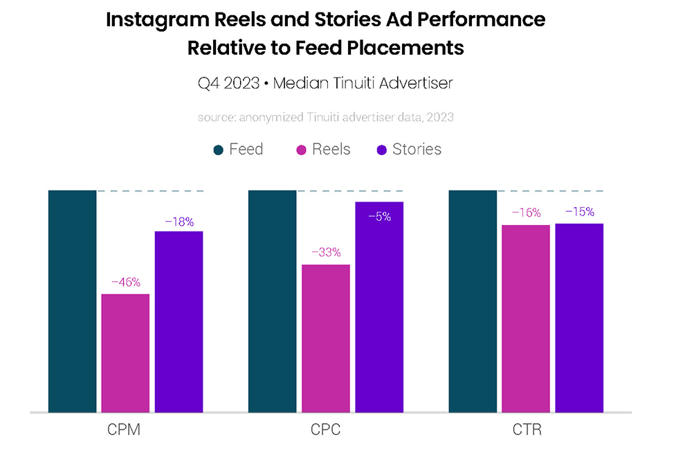 The cost of Reels video ad impressions was 46% lower than that of Instagram Feed ad impressions in the final quarter of 2023, with the cost of clicks coming in 33% lower. Stories ads also have a meaningfully lower CPM than Feed ads, but CPC was just 5% lower, as the difference in CPM is largely the result of the difference in expected CTR for the two placements. It remains the case that Reels video CPC should grow closer to Feed over time, but advertisers are still a ways away from that.