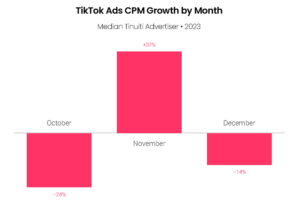 The cost of TikTok ad impressions soared 37% year over year for the median Tinuiti advertiser in November, a huge acceleration from the 24% year-over-year decline observed in October. CPM growth then quickly fell back to negative territory in December, finishing the year down 14% compared to the same month last year. Importantly, ad pricing is affected not only by the competitive forces impacting ad auctions, but also by advertisers deploying different ad types over time.