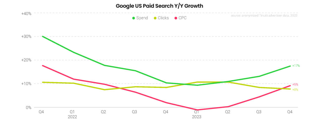Bolstered by strong holiday demand in November, spending on US Google search ads rose 17% Y/Y in Q4 2023, an acceleration from 13% growth in Q3. Google click growth held steady at 8% Y/Y, while CPC growth accelerated to 9% Y/Y. Google search CPCs fell year over year to begin 2023, but growth has rebounded in the quarters since, particularly for Google’s text ads.