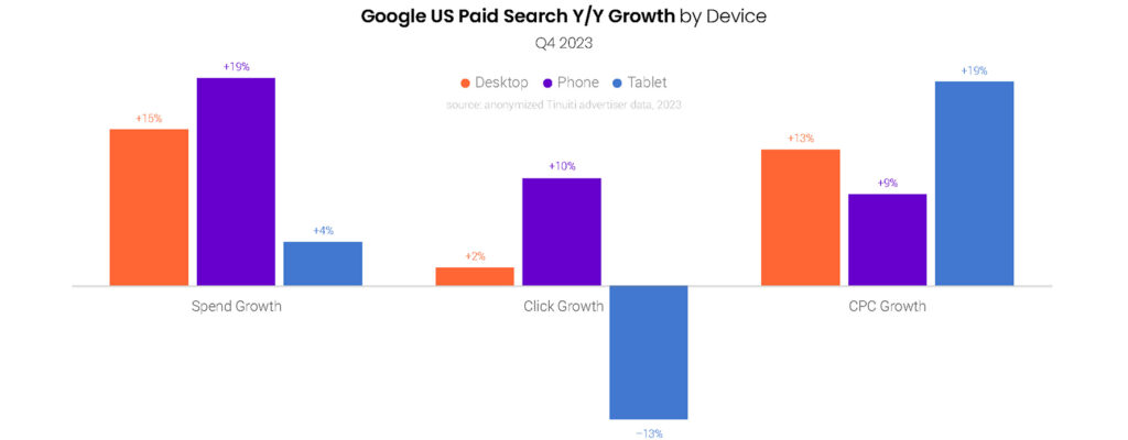 Accounting for over three-quarters of Google search ad clicks, phones delivered 19% Y/Y spending growth in Q4 2023, with clicks up 10% Y/Y and average CPC up 9%. Desktops and laptops saw Google search spending rise 15% Y/Y, but on just a 2% increase in clicks as CPCs rose 13%. Tablets continued to generate a smaller share of Google search traffic, with search ad clicks down 13% Y/Y. Tablet CPCs were up 19% Y/Y though, leading to a 4% increase in spend.