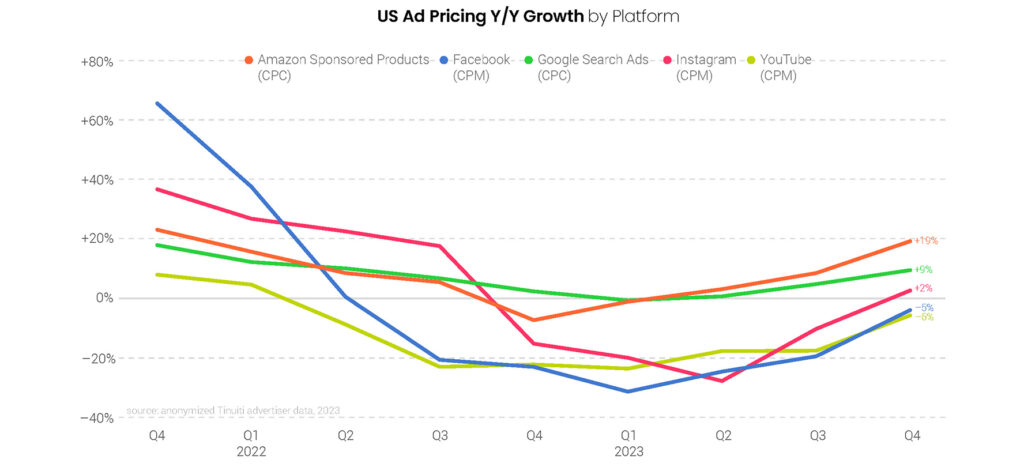 Amazon Sponsored Products, Facebook, Instagram, Google search, and YouTube all saw higher pricing growth in Q4 2023 than in Q3, with all but Google seeing a double-digit acceleration in growth. Pricing growth for platforms like Google and Amazon that are typically managed with a focus on CPC continue to see the highest pricing growth, but the CPM-focused platforms are closing the gap.