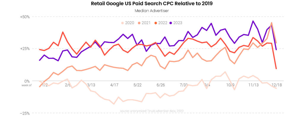 Over the course of Q4 2023, retailers’ Google search ad CPCs were up by an average of 36% over 2019 levels. Google CPCs had dropped in mid-2020, but recovered by the end of that year. CPCs then accelerated sharply during 2021, before stagnating over 2022. After a relatively weak start to 2023, Google CPCs picked up over the year, ultimately hitting a peak of a 47% increase over 2019 levels during the week of Thanksgiving 2023.