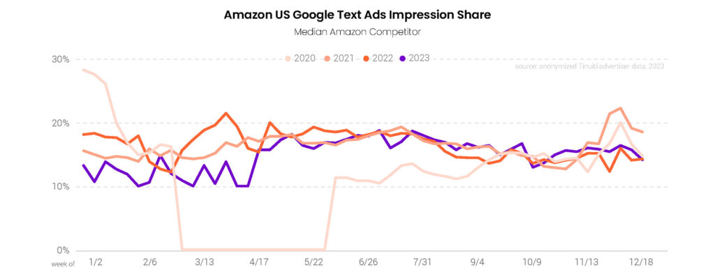 After starting 2023 on a weak note, Amazon’s presence in Google text auctions trended similarly to 2022 for the back half of the year, including throughout the height of the holiday shopping season. While Amazon’s share of text ad impressions spiked in early December of 2020 and 2021, it largely held steady during the same period in 2022 and 2023.