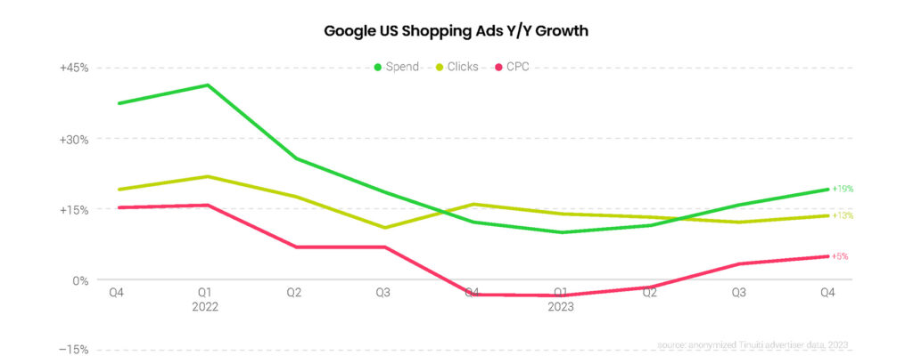 Spending across Google Shopping and Performance Max campaigns was up 19% Y/Y in Q4 2023, an acceleration from 16% growth a quarter earlier. Shopping ad click growth was 13% Y/Y in Q4, a slight increase from Q3. Google shopping CPC growth accelerated to 5% Y/Y in Q4, after having run in negative territory for the first two quarters of the year. The contribution of PMax campaigns to year-over-year shopping spending growth remained relatively strong in Q4 2023 as a number of brands adopted PMax over the course of 2023.