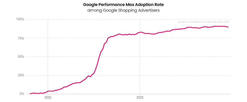 Among retail advertisers running shopping ad listings with Google during the peak of the holiday shopping season in Q4 2023, 91% included Performance Max campaigns in the mix. A year earlier, 80% of retailers had adopted PMax campaigns. After rising over the course of 2023 and with little room left to rise, adoption of Performance Max campaigns does appear to have leveled off.