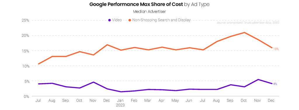 While PMax remains driven primarily by shopping ad listings, the contribution of video and non-shopping display and search ads, including text ads, has been trending higher over time. In Q4 2023, video accounted for 6% of PMax costs in November, an all-time high. The share of PMax spend produced by non-shopping search and display listings hit an all-time high of 21% a month earlier. Over the full quarter, video and other non-shopping inventory contributed an average of 23% of PMax spend, up from 20% in Q3.