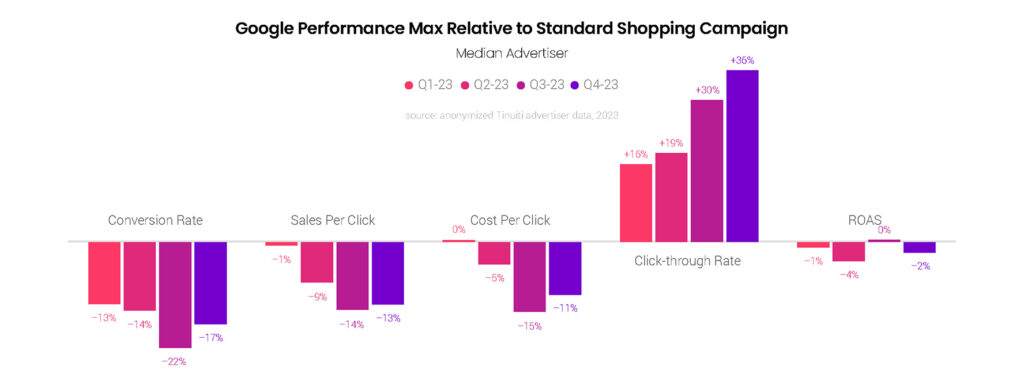 Despite drawing in a larger share of costs from non-shopping inventory in Q4, the performance of PMax campaigns improved relative to standard Google Shopping campaigns across most key metrics. The typical advertiser saw PMax campaigns generate a 13% lower sales per click than standard Shopping campaigns in Q4, but that was up from a 14% deficit a quarter earlier. By keeping CPCs in check, PMax advertisers have been able to achieve a similar ROAS for PMax campaigns as standard Shopping campaigns. In Q4, PMax ROAS was just 2% lower.