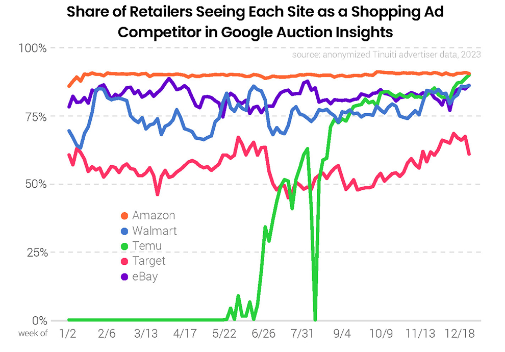 In the final week of 2023, 90% of retailers saw Temu listed as a top competitor for Shopping impressions in Google’s Auction Insights report. That rate matched the level that Amazon has consistently achieved over the last two years as the most commonly seen competitor in Shopping auctions. Retailers did not see Temu in Google Shopping auctions at all until the tail end of 2022. Temu’s presence in Shopping auctions ramped up sharply over the first half of 2023, though, and ticked up to close out the year.