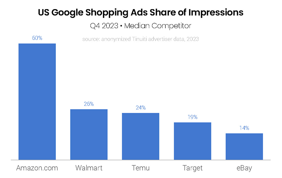 Although Temu competed with nearly as many retailers as Amazon for Google Shopping impressions in Q4 2023, its share of impressions received remained quite a bit lower. When Amazon was eligible for impressions in an auction against a Tinuiti client, its median impression share was just under 60%. For Temu that rate was 24%. Still, Temu’s typical impression share was roughly on par with Walmart and ahead of other major players in the retail space like Target and eBay.
