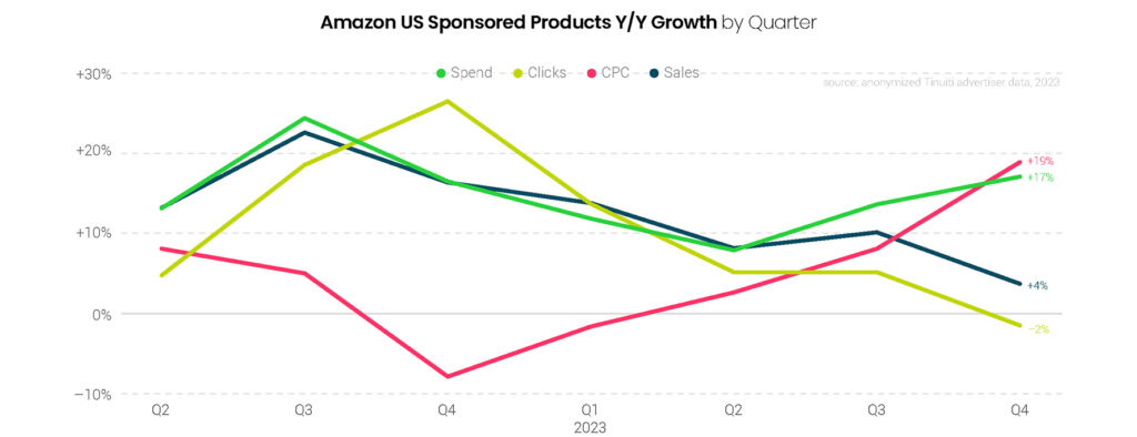 Amazon advertisers saw Sponsored Products CPC grow at least 16% year over year in each month of Q4, a level of growth not observed on a monthly level since April 2022. Sponsored Brands CPC growth peaked at 6% in November and grew just 2% year over year in the final quarter, compared to 19% growth for Sponsored Products. Still, Q4 marked the strongest Sponsored Brands CPC growth on a quarterly level since Q3 2022.