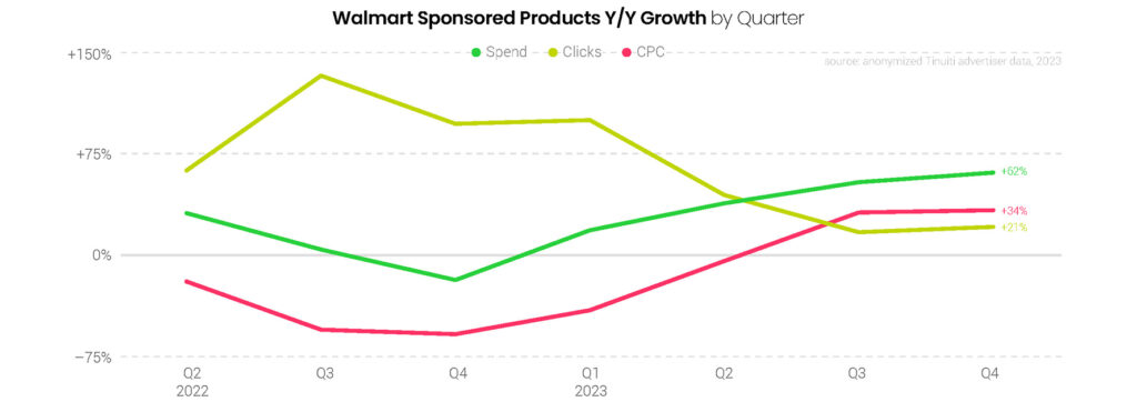 As two rising platforms in the digital ads industry, Walmart and TikTok both saw stronger spending growth in Q4 2023 than the bigger players with Walmart Sponsored Products spending up 62% Y/Y, while TikTok ad spending was up 64%. Walmart has seen a strong turnaround in growth for its CPCs, which had fallen sharply due to a change to Walmart’s auction mechanics in mid-2022.