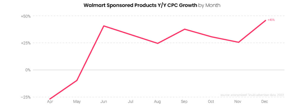 The average CPC of Walmart Sponsored Products ads rose 46% year over year in December, the strongest growth of the year, as competition among advertisers heated up to attract high-converting customers during the holiday shopping season. CPC rose at least 25% year over year in each of the last seven months, as pricing recovered following the Q2 2022 update to switch from a first-price auction to a second-price auction, which sent CPC crashing down for most advertisers.