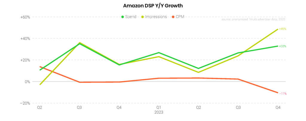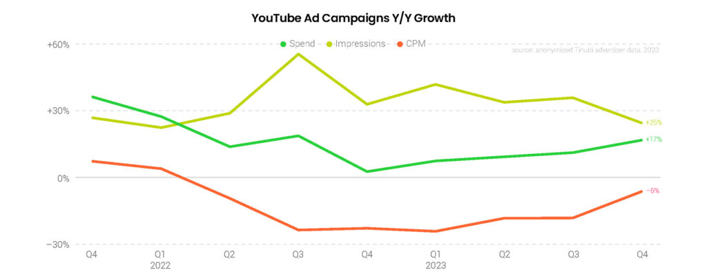 Spending on TikTok advertising grew 64% year over year for the median Tinuiti advertiser in Q4 2023, the fastest growth observed since the previous Q4 when spend grew a whopping 81%. Impression growth more than doubled from 21% in Q3 2023 to 44% in Q4. TikTok CPM rose 14% in the final quarter, the fastest pricing growth observed since the first quarter of 2023 after two straight quarters of year-over-year CPM declines in the middle of the year, as brands ramped up spending on the platform to reach holiday shoppers.