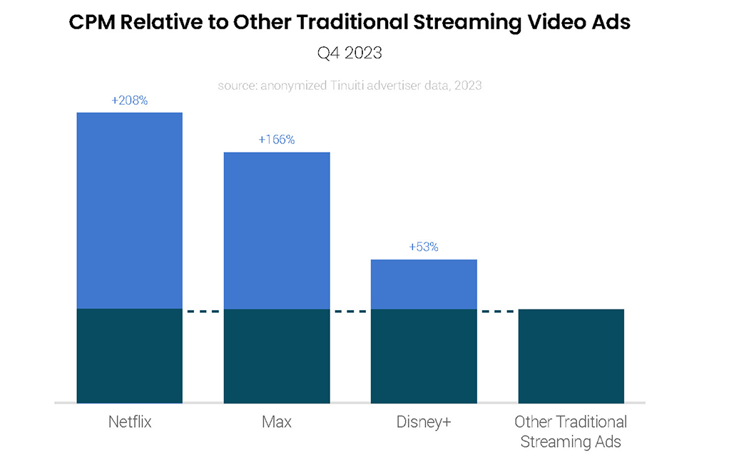 For streaming video ads outside of YouTube, including on platforms like Hulu, Netflix, and Max, advertiser spending rose 10% Y/Y in Q4 2023, up from 7% a quarter earlier. With more premium inventory coming online in recent quarters, streaming video CPM growth was fairly stable over 2023 even as CPMs fell by as much as 24% for YouTube. In Q4 2023, streaming CPMs fell 1% Y/Y, compared to the 6% decline for YouTube.