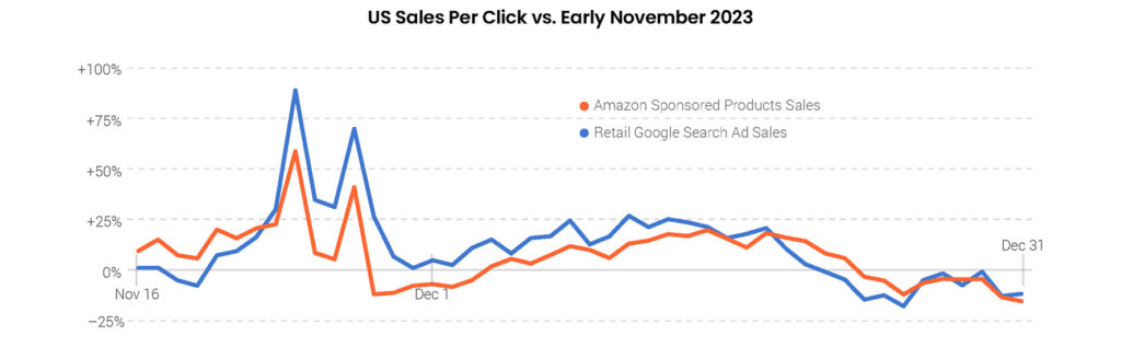While AOVs may no longer be driving sales per click growth in year-over-year terms, brands still saw massive swings in sales per click as the holiday shopping season progressed, as expected. Compared to early November results, sales per click soared just ahead of and during the Cyber Five, but fell sharply after Cyber Monday. For Amazon, which ran an eleven-day promotional period in the lead up to Cyber Monday, sales per click ran below early November levels for a period into early December.