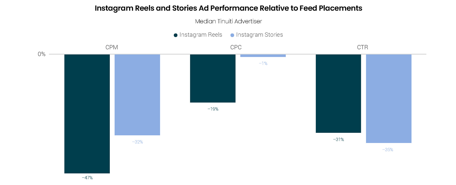 The CPM of Instagram Reels ad impressions was 47% lower than that of Instagram Feed placements for the median Q1 2023 advertiser in the first quarter, while CPC was 19% lower. Stories CPM was 32% lower than feed, but CPC was nearly identical, as the difference in CPM between Feed and Stories is roughly the same as the difference in CTR between these two placements for most advertisers. The CPC of Instagram Reels should come more in line with that of Feed placements over time as more advertisers enter Reels auctions and competition grows.