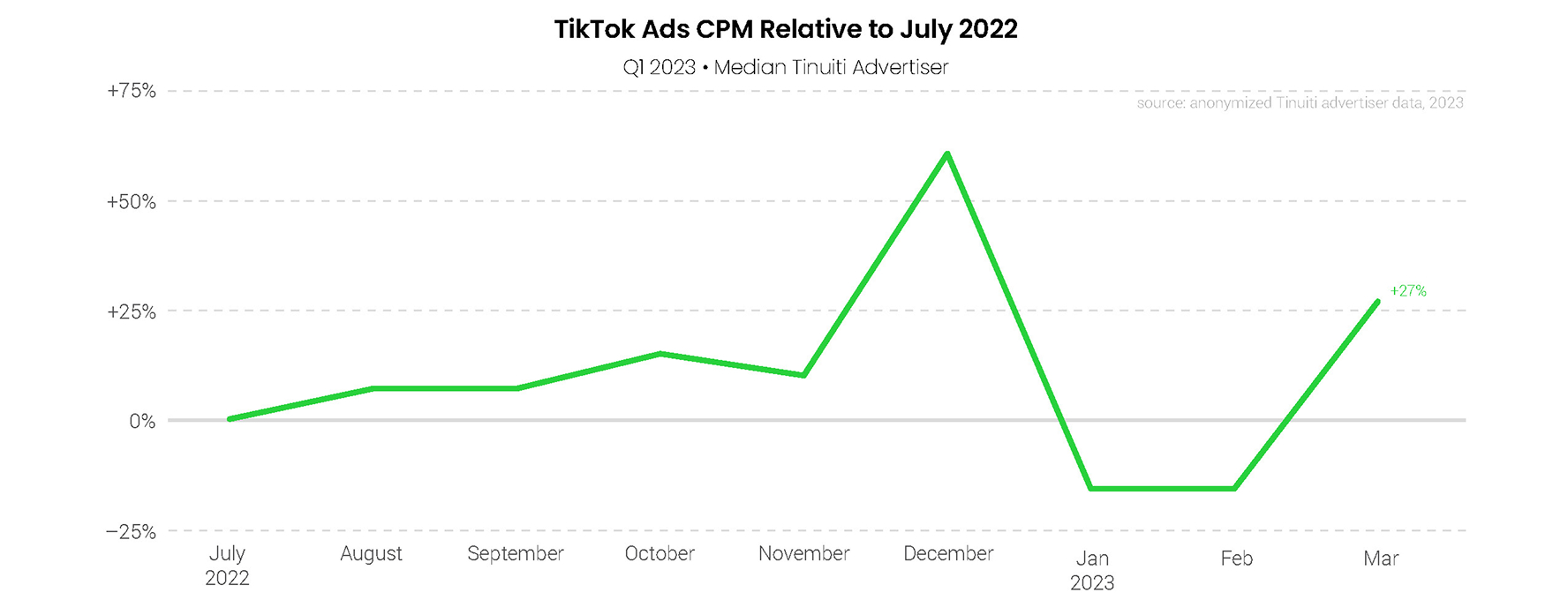 CPM for TikTok Ads was 61% higher in December than in July 2022 for the median Tinuiti advertiser, as compeitition ramped up for the Q4 holiday shopping season. Ad pricing metrics are also impacted by updates to placements and campaign types, such that movement in CPM isn’t solely the result of more or less competition at any given time, and TikTok continues to roll out new formats as it courts advertising dollars.