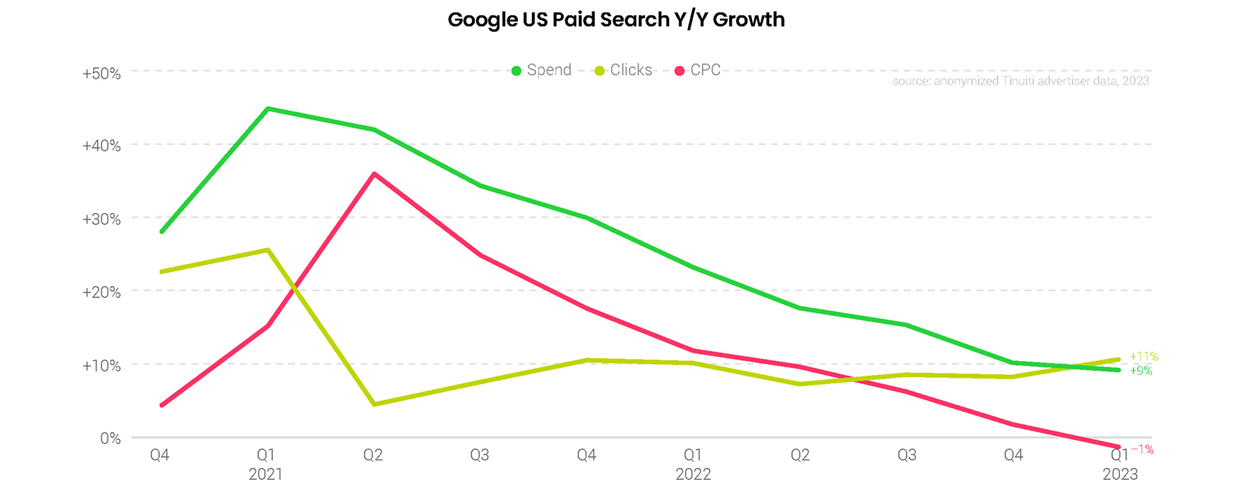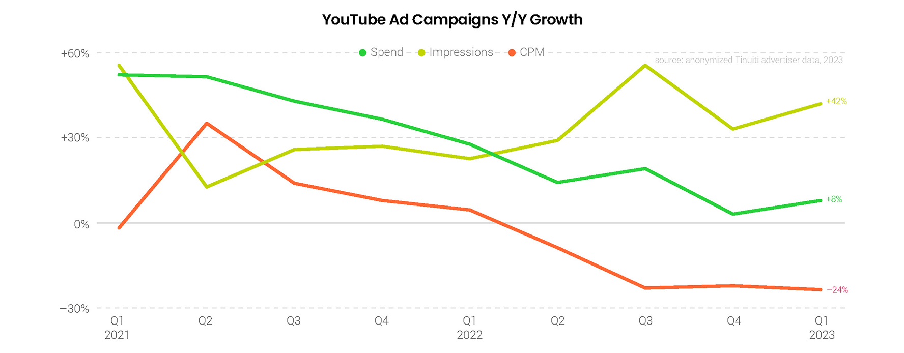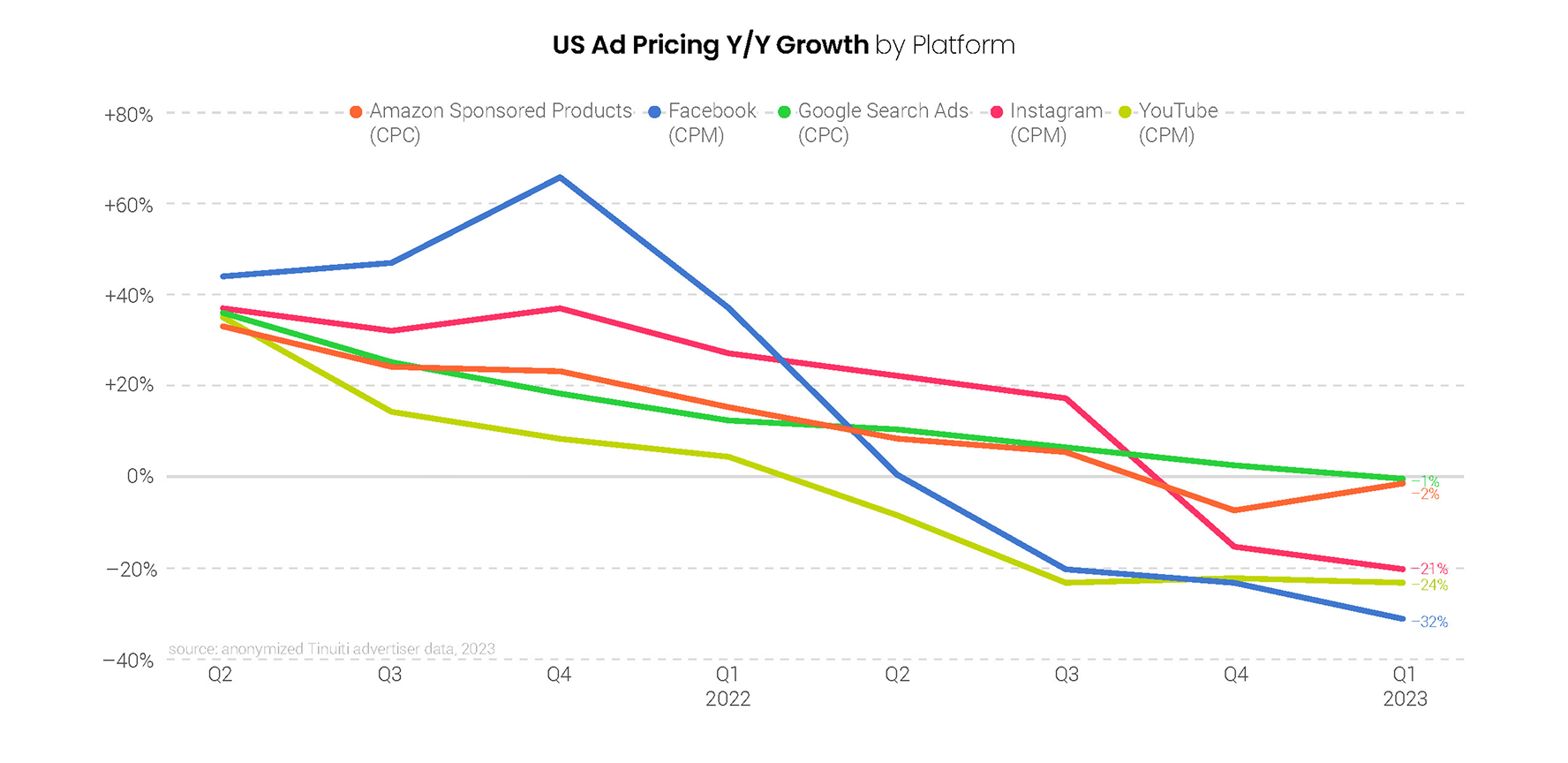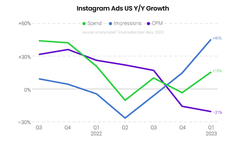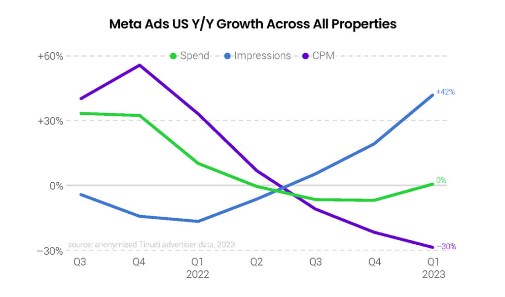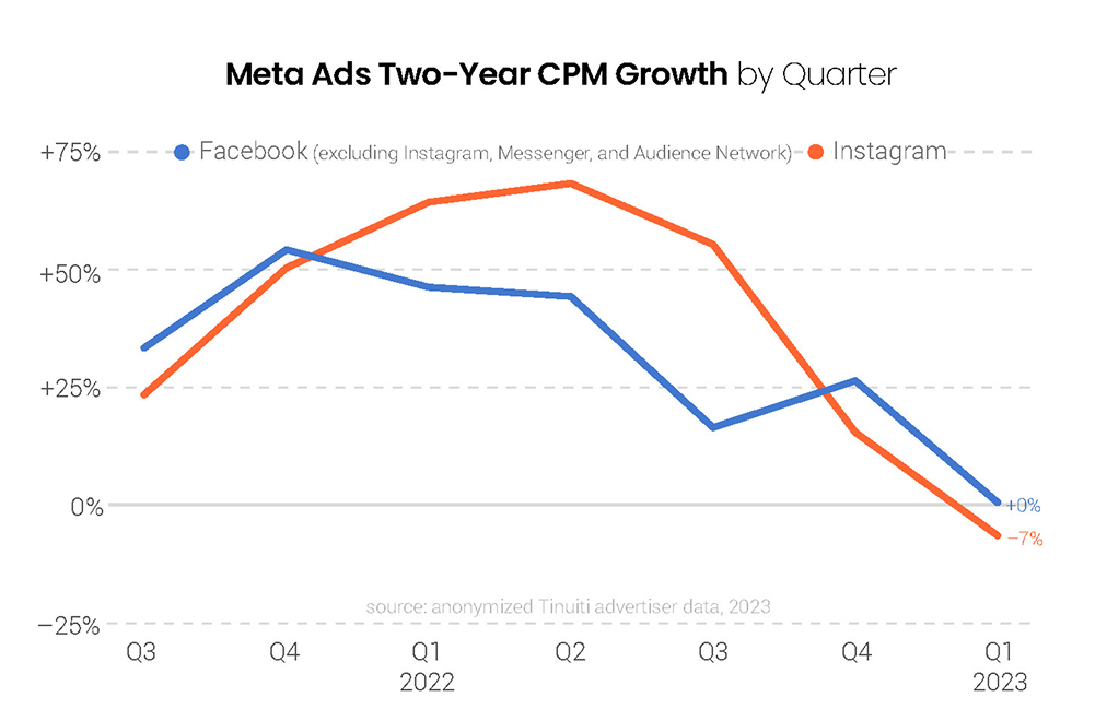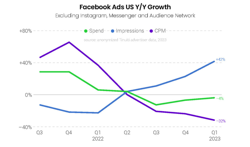 Facebook ad impression growth nearly doubled once again, rising from 23% in Q4 2022 to 42% in Q1 2023, as impression volume metrics continue to recover after large declines in Q4 2021 and Q1 2022. Spend declined 4% year over year, an improvement from the 7% decline observed in Q4, while CPM fell 32% in the first quarter of the year, the biggest decline observed in the last four years for Tinuiti advertisers.