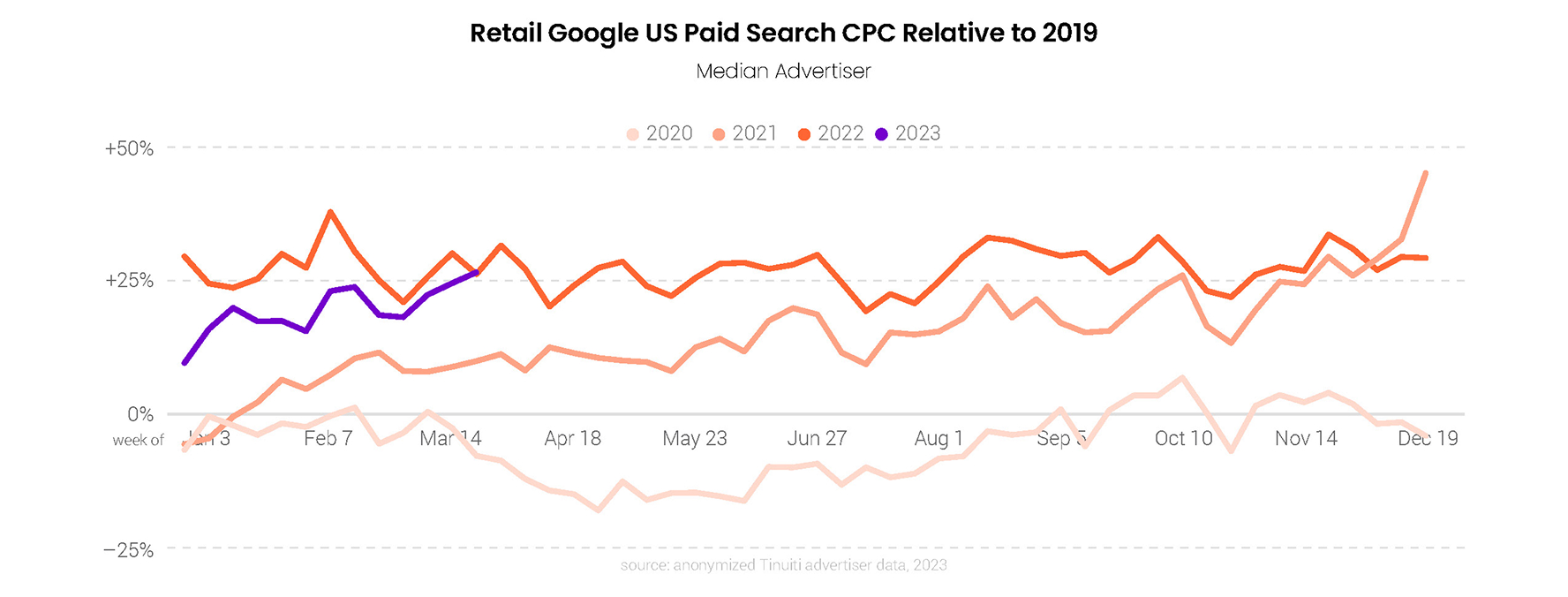 While Google search CPCs may have declined overall in Q1, they are still running considerably above prepandemic levels and retailers saw CPCs close the gap with 2022 levels by the end of the quarter. Weekly retail Google search CPCs were up by an average of 20% compared to 2019 levels in Q1 2023, down from 27% average growth a year earlier. After a weak start to the year, retail CPC growth picked up, with CPCs ultimately running higher than 2022 for the final full week of Q1.