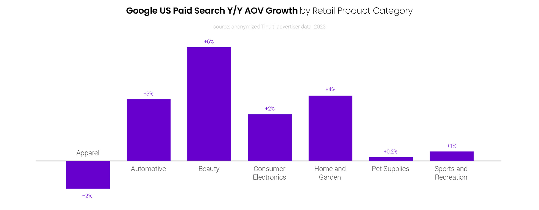 Across the seven product categories assessed for this report, only sports and recreation saw stronger Google search ad AOV growth in Q1 2023 than in Q4 2022. Sports and recreation AOV was up 1% Y/Y in Q1, compared to a 9% decline in Q4. Apparel was the only category to see a year-over-year decline in AOV in Q1, with AOV falling 2%. Automotive saw the biggest deceleration in AOV growth between Q4 and Q1, with AOV up just 3% Y/Y to start 2023, compared to 11% growth a quarter earlier.