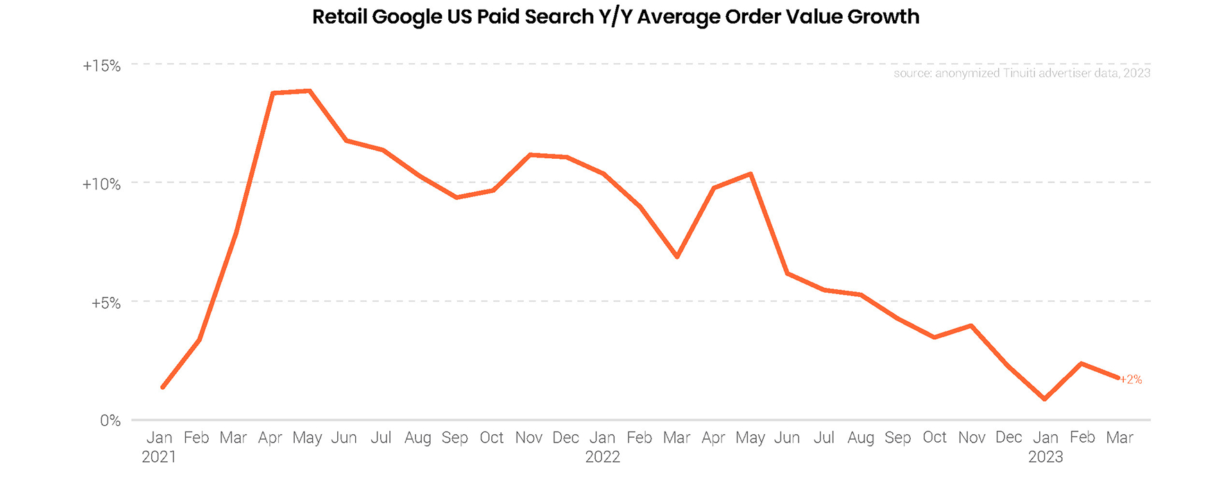 While official measures of inflation show that US consumer price growth has been decelerating since mid-2022, growth in the average order value generated by Google search ads has been slowing since about a year earlier. With comparisons against the early months of the pandemic, AOV growth spiked to 14% Y/Y in Q2 2021, but has trended lower since, which may help explain why Google search CPC growth has slowed over the same period. In Q1 2023, Google search ad AOV was up just 2% Y/Y.