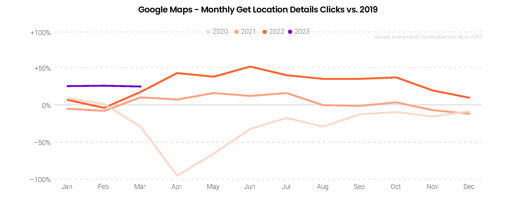 Compared to 2019, clicks from Google Maps on the location details of brick-and-mortar stores were up by 27% in Q1 2023. A year earlier, Get Location Details clicks were up by an average of just 8% in Q1 compared to 2019. Consumer interest in physical store locations strengthened in mid-2022, following a relatively weak start to the year which coincided with the strong Omicron wave of the pandemic.