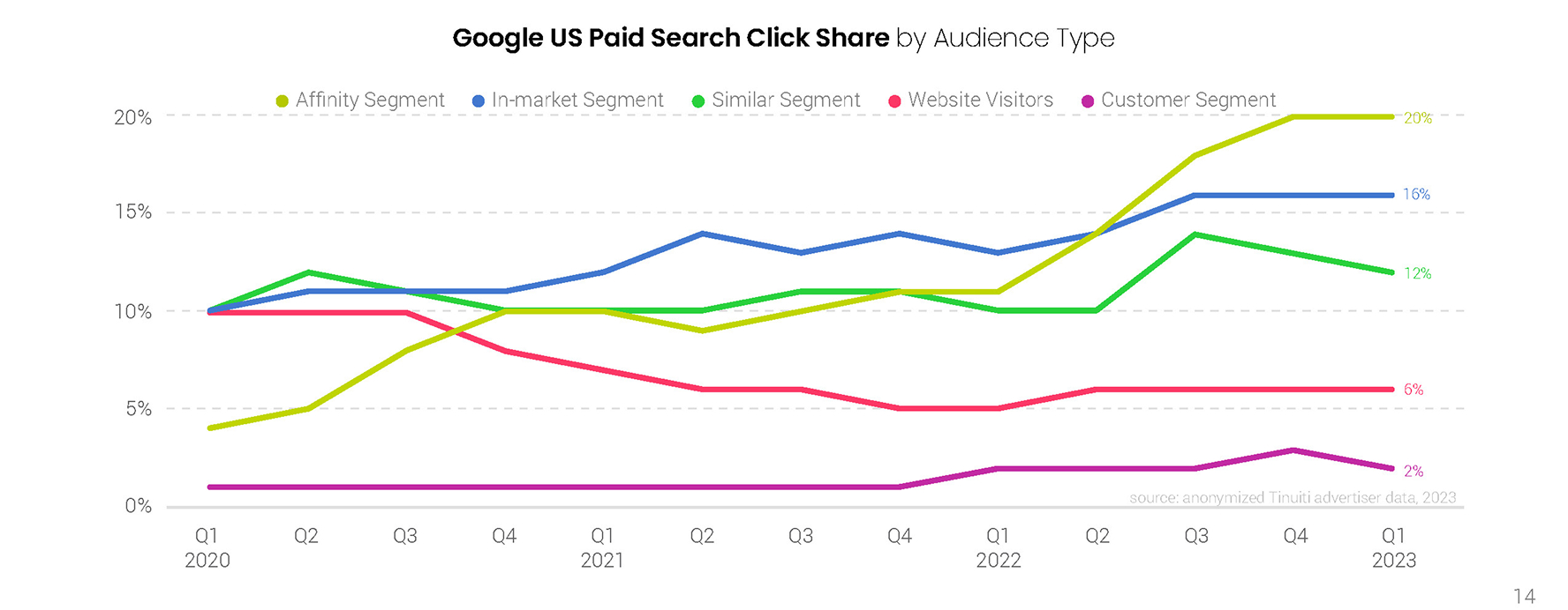 The share of Google search ad clicks produced by its most popular audience segments was largely unchanged in Q1 2023 compared to a quarter earlier, with Similar audiences as a notable exception. Similar audience share has fallen about two points since Google announced in November 2022 that it would sunset the segment beginning in May 2023. As Google works through this process, it is encouraging advertisers to adopt its more automated solutions of optimized targeting, audience expansion, and Smart Bidding.