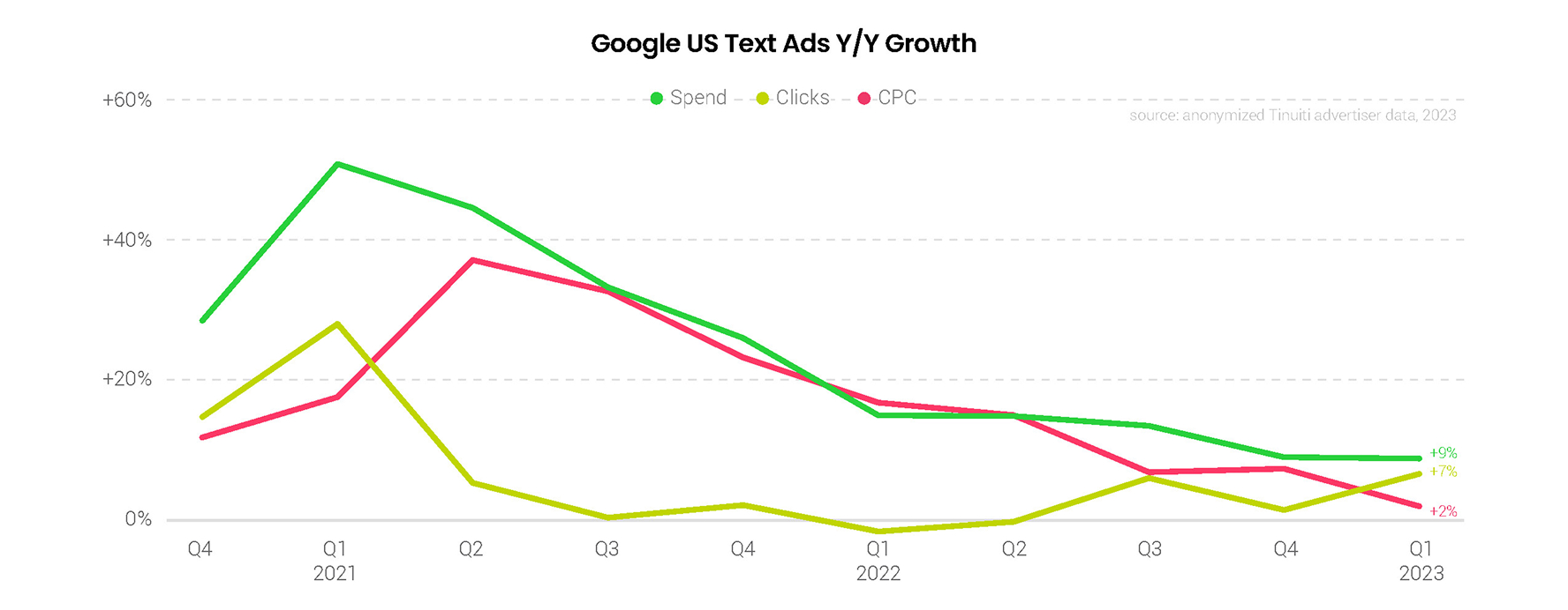 Spending on Google search text ads was up 9% Y/Y in Q1 2023, which was steady with a quarter earlier. Text ad clicks grew 7% in Q1, which was the strongest growth advertisers have seen since the first quarter of 2021. Text ad pricing growth, however, continued to weaken with CPCs up just 2% Y/Y in Q1 2023. After peaking at 37% Y/Y in Q1 2021, text ad CPC growth has now slowed for seven quarters in a row.