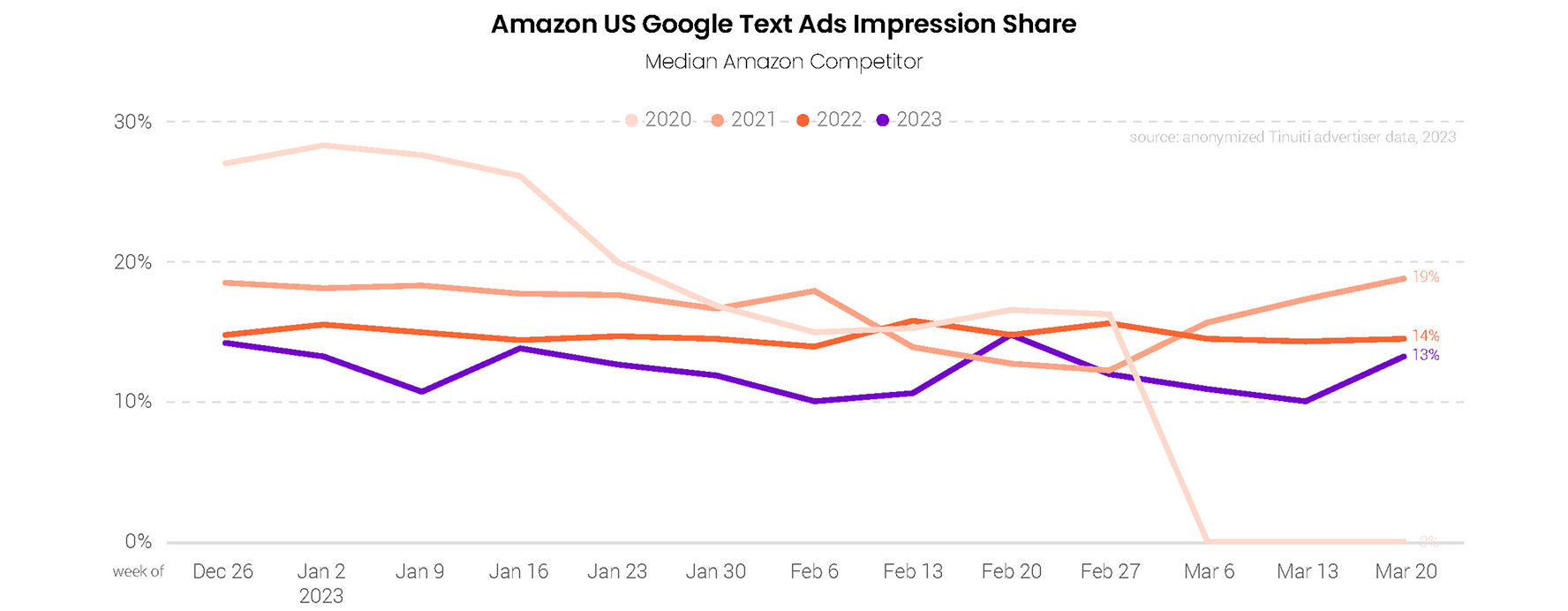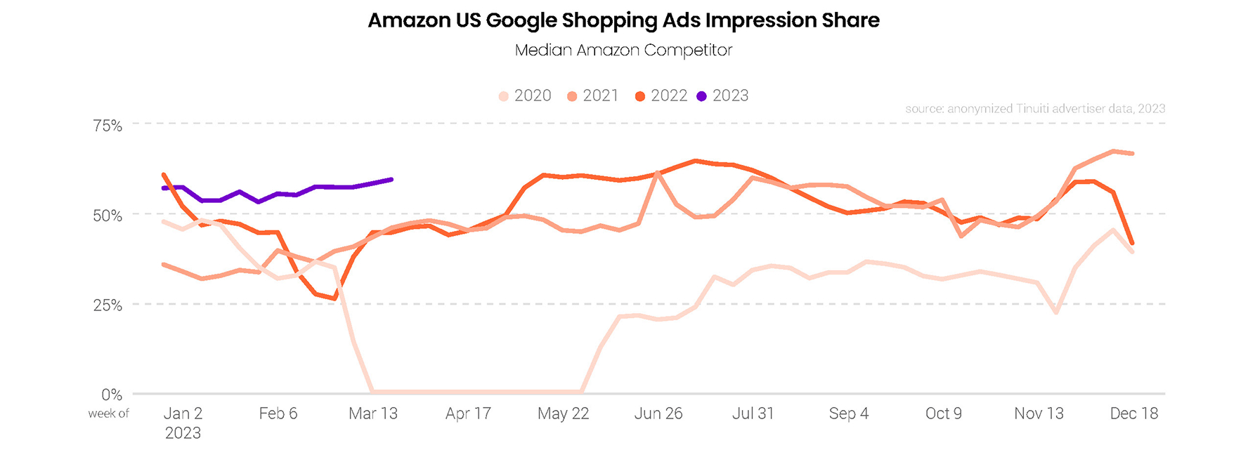 Contrary to trends on the text side of Google’s search ad business, Amazon appears to be as aggressive as ever in securing Google Shopping impressions. After running roughly in line with 2021 for much of late 2022, Amazon’s share of Google Shopping impressions fell to close out Q4, but it quickly recovered to start 2023. Over the second half of Q1, Amazon’s share of Google Shopping impressions was up by an average of 20 points compared to a year earlier.