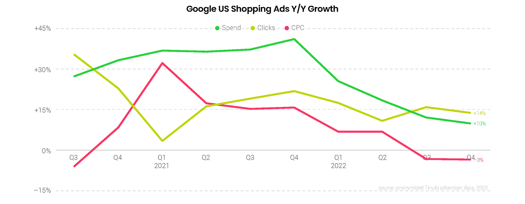 Spending on Google Shopping ads, including inventory purchased through Performance Max campaigns rose 10% Y/Y in Q1 2023, down from 12% growth a quarter earlier. While Google’s late 2022 transition from Smart Shopping to Performance Max campaigns was an important milestone, it hasn’t led to a significant change in trending for Shopping ads yet. As with Google text ads, Shopping CPC growth slowed, albeit slightly, for the seventh quarter in a row in Q1. Shopping clicks were up 14% Y/Y in Q1, down from 16% in Q4.