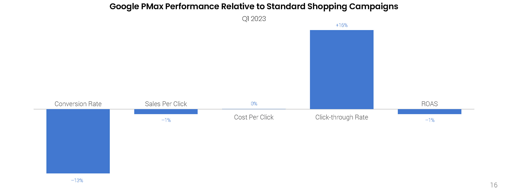 In the third quarter since Google began its transition from Smart Shopping to Performance Max campaigns, the newer AIdriven model delivered strong results for advertisers. Average sales per click and cost per click for PMax campaigns were comparable to standard Shopping campaigns in Q1 and over 80% of Shopping advertisers employed PMax campaigns during the quarter.