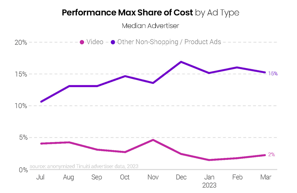 In Q1 2023, 83% of Performance Max spending was generated by Shopping ads on Google’s search network or similar dynamic product ads on its display network. That was up a point from Q4 2022, when Shopping/product ad inventory accounted for an average of 82% of Performance Max costs. Video inventory fell to just 2% of PMax spending in Q1, while other non-Shopping inventory, which includes display and search text ads, accounted for a slightly higher share of PMax costs in Q1 than in Q4.