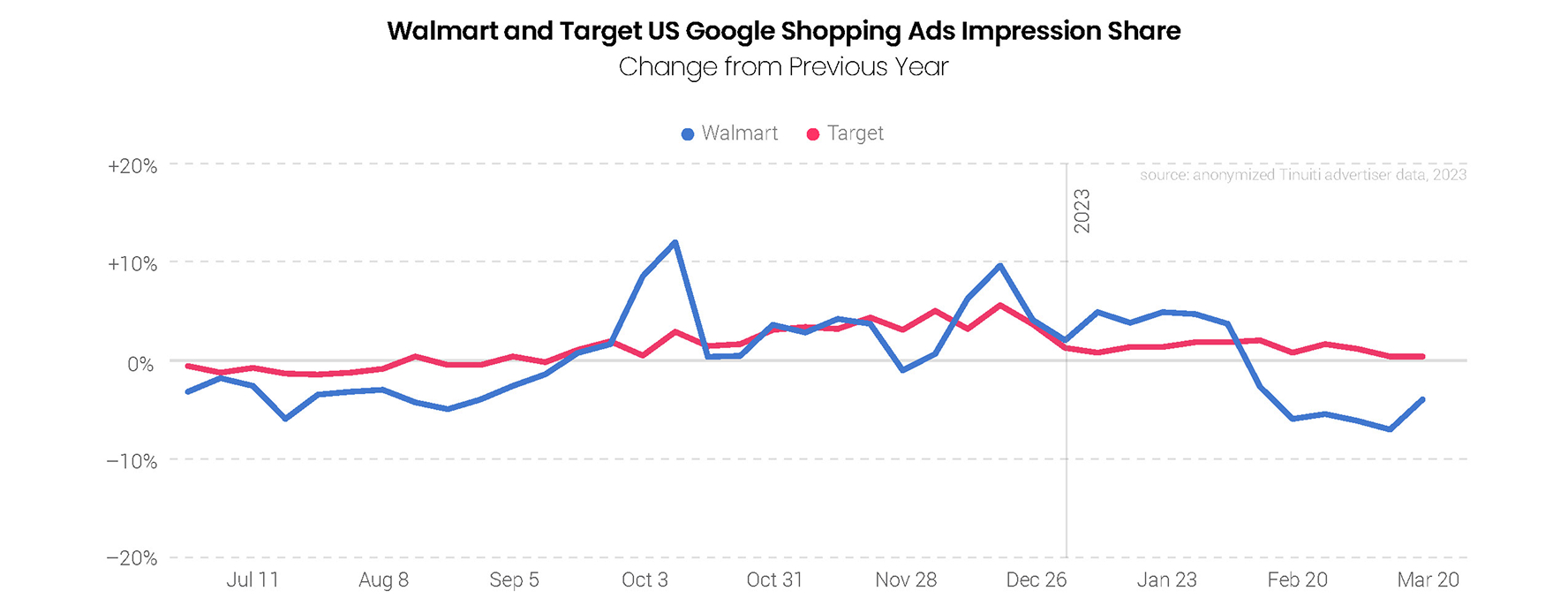 Amazon’s share of Google Shopping impressions appears to be getting a bit of help from Walmart running less aggressively in Shopping auctions, at least toward the end of Q1. Compared to a year earlier, Walmart closed out Q1 with a five-point decline in Shopping impression share. As has typically been the case, Target’s share of Shopping impressions fluctuated less than Walmart’s in Q1, averaging just a one-point increase from the year before, with little movement throughout the quarter.