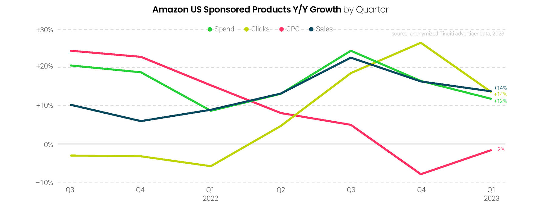 Advertisers grew Sponsored Products investment by 12% year over year in Q1, slowing from 17% in Q4 as click growth decelerated from 27% to 14%. The first quarter of 2023 was the first quarter since Q2 2022 in which Amazon did not run a major Prime member event, though the October Prime Early Access Sale paled in comparison to July’s Prime Day event in terms of driving up demand. Q1 2023 marked the second straight quarter of year-over-year CPC declines for Sponsored Products advertisers.