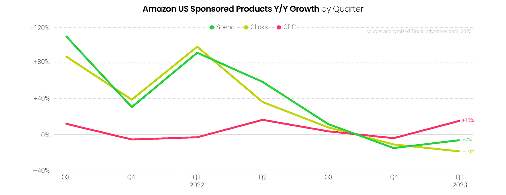 After two straight quarters of deceleration and a Q4 Y/Y decline, Amazon Sponsored Display click growth rebounded to 15% in Q1 2023. Spend fell 7% year over year for the quarter, an improvement from the 16% decline observed in the final quarter of 2022. CPC growth decelerated for the fourth straight quarter, falling 19% year over year in Q1 2023 after rising an astonishing 99% year over year in Q1 2022. Sponsored Display ads aren’t always purchased on a CPC basis, as advertisers can choose to bid based on the cost of viewable impressions.