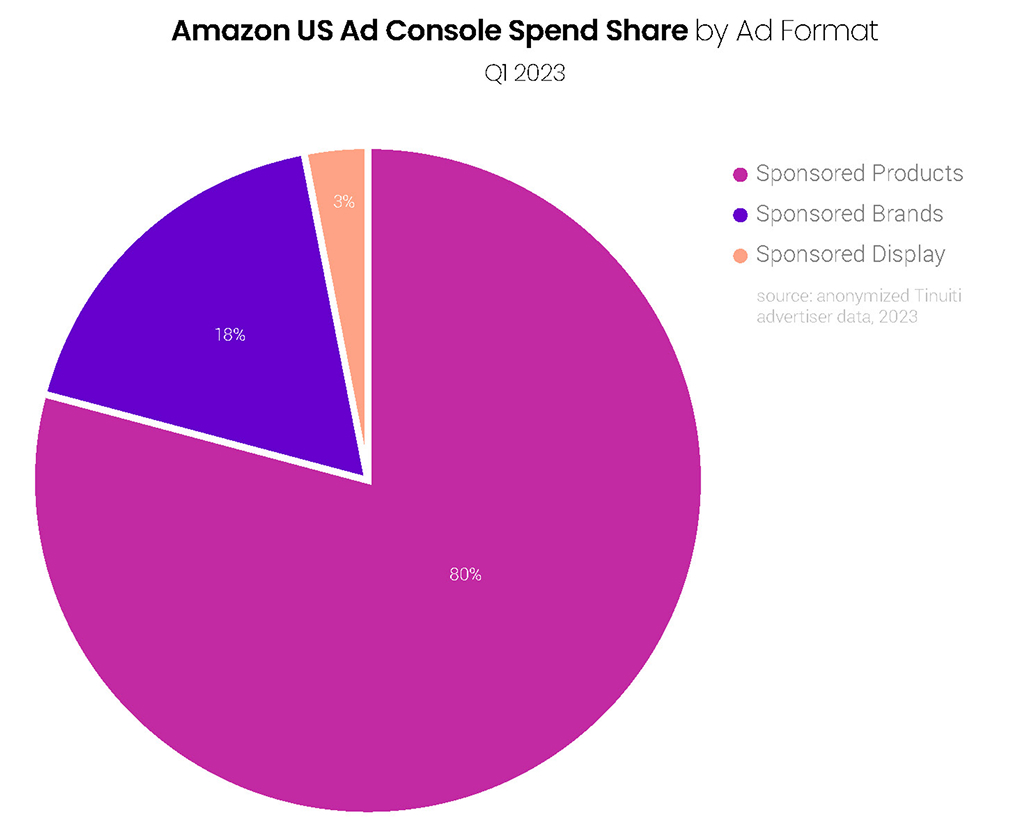 Sponsored Products accounted for 80% of all Amazon Ad Console spend in the first quarter of 2023, up from 78% in Q4, as Sponsored Products growth far outpaced that of Sponsored Brands and Sponsored Display in Q1. While Sponsored Brands and Sponsored Display can be effective campaign types to drive direct response, Sponsored Products campaigns are still viewed by most advertisers as the most effective vehicle for high-return, demand capture efforts among Ad Console formats.