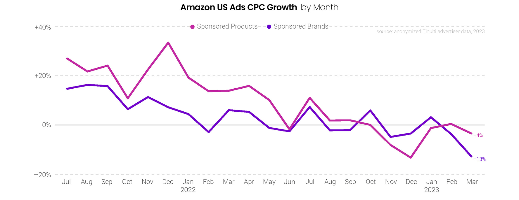 Sponsored Products CPC growth rebounded from a 14% decline in December to just a 1% decline in January. Sponsored Brands CPC growth also jumped from a 4% decline in the last month of 2022 to 3% in the first of 2023. In the case of both formats, however, CPC growth grew softer to end the quarter, as March CPC was down 4% year over year for Sponsored Products and 13% for Sponsored Brands. Sponsored Products ad pricing movement has largely tracked with changes in sales per click since the end of 2021.