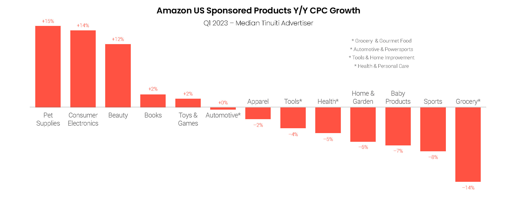 In Q4 2022, just two out of thirteen major product categories studied for this report showed positive year-over-year CPC growth. In Q1 2023, that increased to five product categories, with pet supplies leading the pack at 15% growth for the median brand. Grocery and gourmet food brands saw the biggest CPC decline in the first quarter with a 14% drop. Across all product categories, Sponsored Products CPC decline went from down 8% in the final quarter of 2022 to just a 2% decline in Q1.