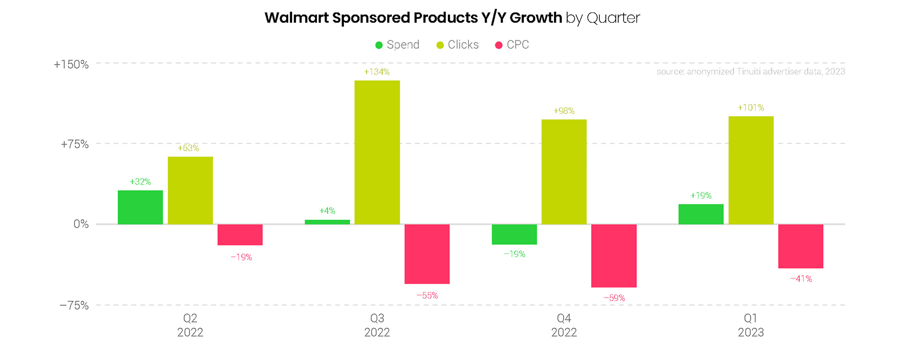 Walmart Sponsored Products clicks more than doubled year over year in Q1 as spend grew 19%. CPC continued to decline for most advertisers and fell 41% Y/Y in the first quarter, as advertisers have yet to lap the Q2 2022 update that changed Walmart ad auctions from first price to second price. The change immediately put downward pressure on the cost of ad clicks as advertisers no longer had to pay the full cost of their bids and instead paid just enough to beat out the advertiser directly below them in each ad auction.