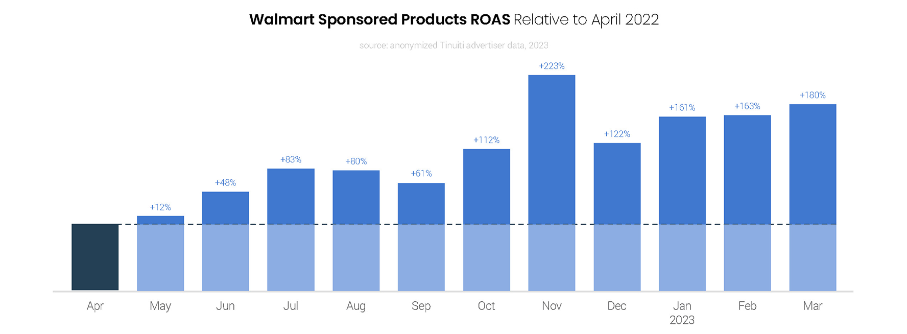 Relative to April 2022, Walmart Sponsored Products ROAS was at least two and a half times as high for every month of Q1 2023, as advertisers continue to reap the benefits of Walmart’s shift to a second-price auction. Another update helping Walmart advertisers achieve greater efficiency has been the rollout of variant bidding, which allows brands to promote any variation of an item in their catalog, rather than just the primary variant. Variant-level bidding rolled out in January 2023 and is already allowing advertisers to direct budget to the variants that perform the best.