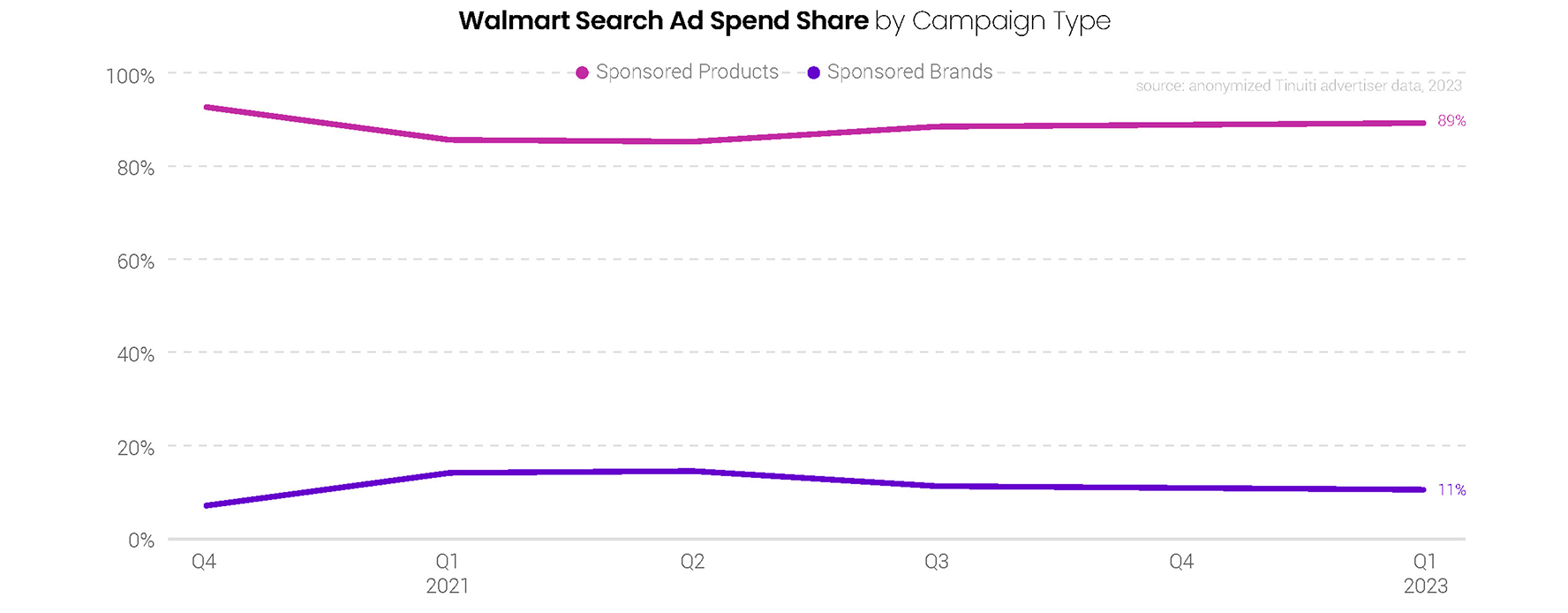 Sponsored Brands once again accounted for 11% of all Walmart search ad spend in Q1, the same share observed in each of the previous two quarters. Sponsored Products continues to account for the lion’s share of Walmart search advertising investment with 89% of total spend. Both Sponsored Products and Sponsored Brands auctions switched from first price to second price in Q2 2022, sending the cost of ad clicks down for each as advertisers no longer had to pay the full amount bid.
