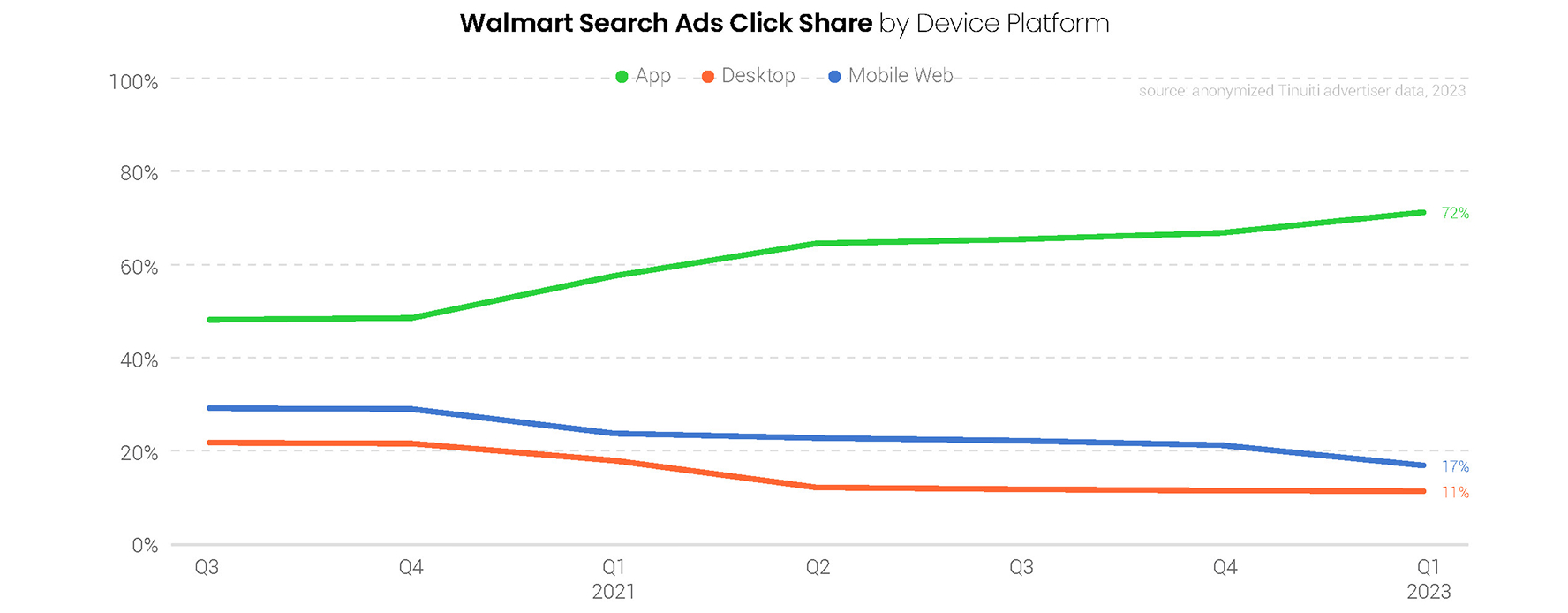 Back in Q3 2021, the Walmart app accounted for just 48% of all Walmart search ad clicks, but that share has steadily grown over the last several quarters and stood at 72% in Q1 2023. Both desktop and mobile click shares have declined over the same time frame, as it appears consumers are increasingly heading to the Walmart app to conduct product searches over time. Desktop continues to account for the highest sales per click, accounting for 17% of sales attributed to Walmart search ads from just 11% of clicks.