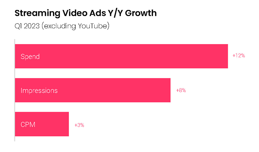 Outside of YouTube, streaming video ad spending grew 12% Y/Y in Q1 2023 among advertisers that remained active in the channel, up from 4% growth in Q4 2022. Streaming impressions were up 8% Y/Y in Q1, steady with Q4, while CPM growth improved from a 4% Y/Y decline in Q4 to a 3% Y/Y increase in Q1. Streaming CPMs have been bolstered in recent quarters from a mix shift from lower-CPM RTB-purchased inventory to more traditional cable and broadcast inventory sources.