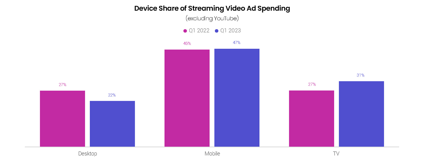 Mobile devices, including both phones and tablets, accounted for 47% of streaming video ad spending outside of YouTube in Q1 2023, up a point from a year earlier. With spending on connected TVs rising nearly 30% Y/Y, TV share of streaming spend rose from 27% in Q1 2022 to 31% in Q1 2023, although TV share was down slightly compared to Q4. Spend share for desktop and laptop computers fell from 27% in Q1 2022 to 22% in Q1 2023.
