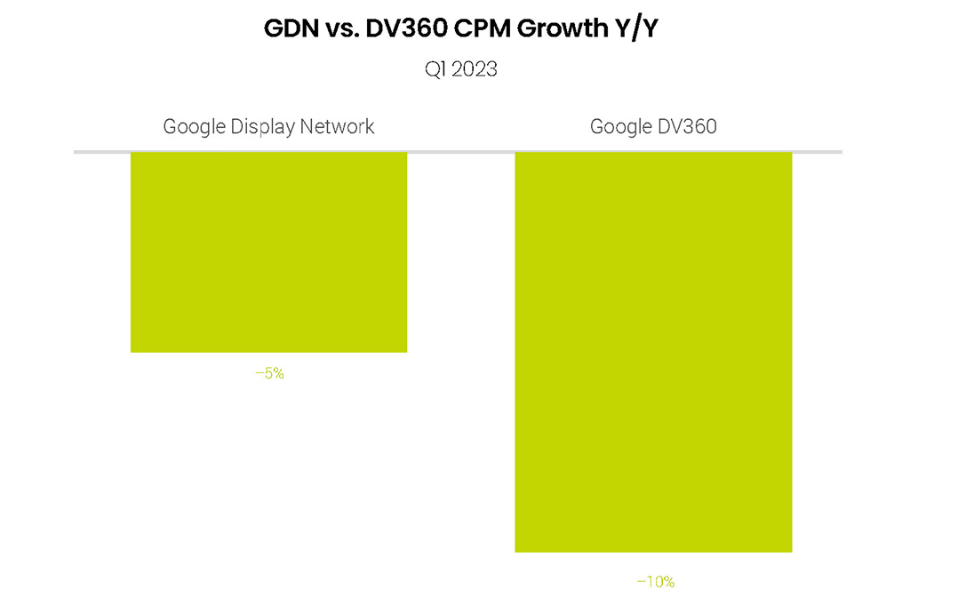 The average CPM advertisers paid for placements on the Google Display Network fell 5% Y/Y in Q1 2023, down from 3% growth a quarter earlier. Average CPM for placements purchased through Google DV360 fell 10% Y/Y in Q1 2023, but that was up from a 15% Y/Y decline in Q4. CPM growth for both platforms has decelerated significantly since Q4 2021, when GDN CPMs were up 31% Y/Y and DV360 CPMs grew 22%.
